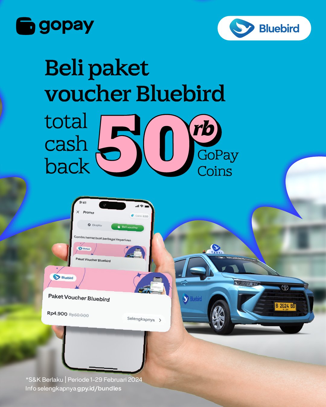 Beli Paket Voucher Bluebird, total cashback Rp 50.000